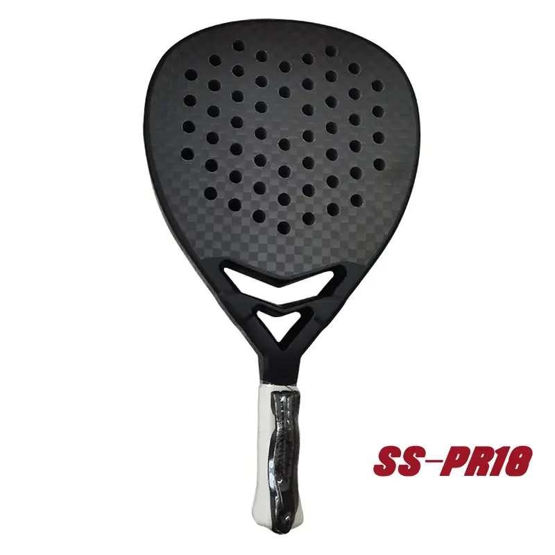 La raqueta de pádel de fibra de carbono con forma de diamante modelo SS-PR18 es la forma favorita de muchos jugadores profesionales. Esta raqueta de carbono tiene forma de diamante, el material del marco es completamente de carbono y el material de la cara es fibra de carbono de 12K. El diseño del puente ofrece precisión y control con buena potencia y alta absorción de vibraciones. con el diseño del puente, esta pádel podría proporcionar el máximo equilibrio. Área del corazón diseñada específicamente con puente inteligente para mayor precisión y control.